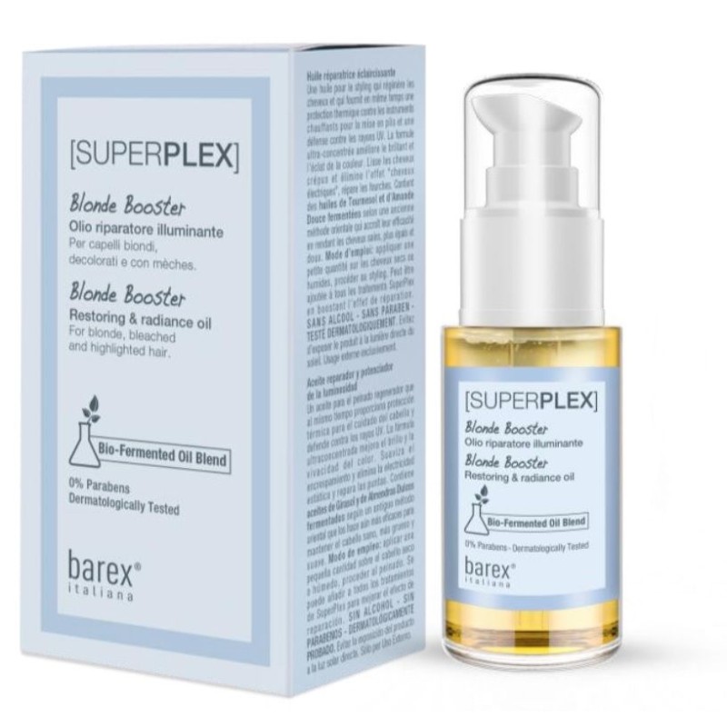 Вид,тип волосся: Фарбоване Властивість: Шовковистість Засіб: ОлійкаBarex Superplex Restoring OilВідновлювальна олія-блискОлія для укладання волосся, максимально посилює блиск і сяйво, надає мʼякості. Збільшує щільність волосся. Полегшує розчісування і надає антистатичний ефект. Забезпечує термозахист в процесі укладання. Захищає волосся від несприятливого впливу УФ-променів.Застосування:Як праймер: нанесіть 4-5 крапель на вологе волосся, зробіть укладку.Як захист: нанесіть 2-3 краплі перед використанням гарячих інструментів.Як фініш: нанесіть 1-2 краплі на довжину та кінчики сухого волосся.Ключові інгредієнти Суперплекс - Комплекс Polyamino Sugar Condensate – суміш протеїнів та цукрів, впливають безпосередньо на дисульфідні містки, відповідальні за міцність та еластичність волосся. Амінокислоти кератину – формують білкові ланцюжки. Діють як філер, проникаючи у структуру волосся.